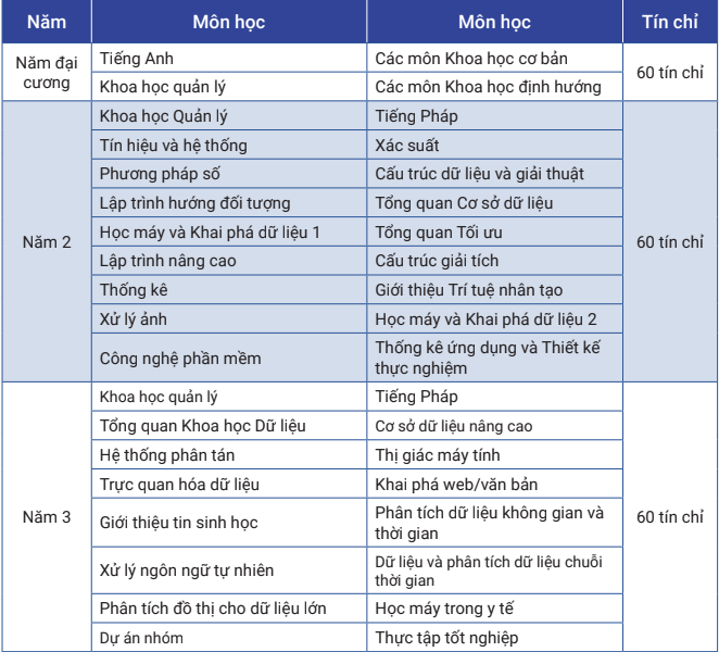 Chương trình cử nhân Khoa học dữ liệu kéo dài 3 năm với 180 tín chỉ, bao gồm: